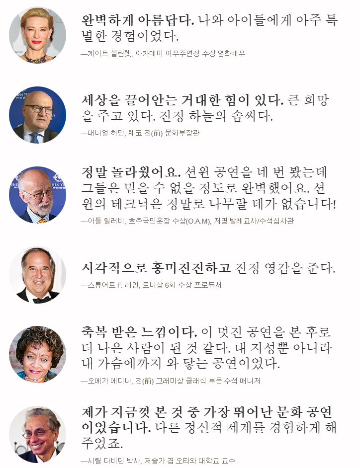이는 방대한 예술 작업으로 션윈은 지난 17년 간 17개의 완전히 다른 새로운 무대로 월드투어를 진행해 왔습니다.
